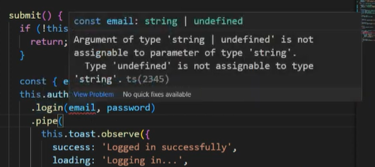 Now our login function here excepts a string value, but Angular says that the email is of type string or undefined. Now since these don’t match, we get this error.